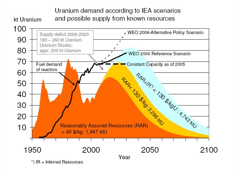 A questo si va ad aggiungere la disponibilità di combustibile: innanzitutto, già ora non ne estraiamo abbastanza e copriamo la mancanza con accumuli e bombe dismesse; inoltre, partendo da dati della Nuclear Energy Agency, l'Energy Watch Group ha sviluppato un grafico delle scorte in relazione a diverse ipotesi di richiesta. Si parla di scorte per ottant'anni (cento, secondo il calcolo NEA), ma ci sono calcoli che danno risultati molto peggiori (trenta/quarant'anni).